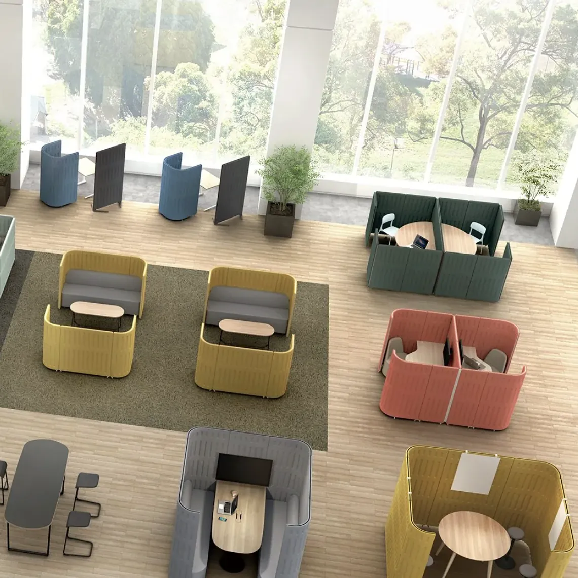 Muffle+ creates booths to fit any space using different panel options. Soft fabric finishes and gentle curves create a calm, working environment.
